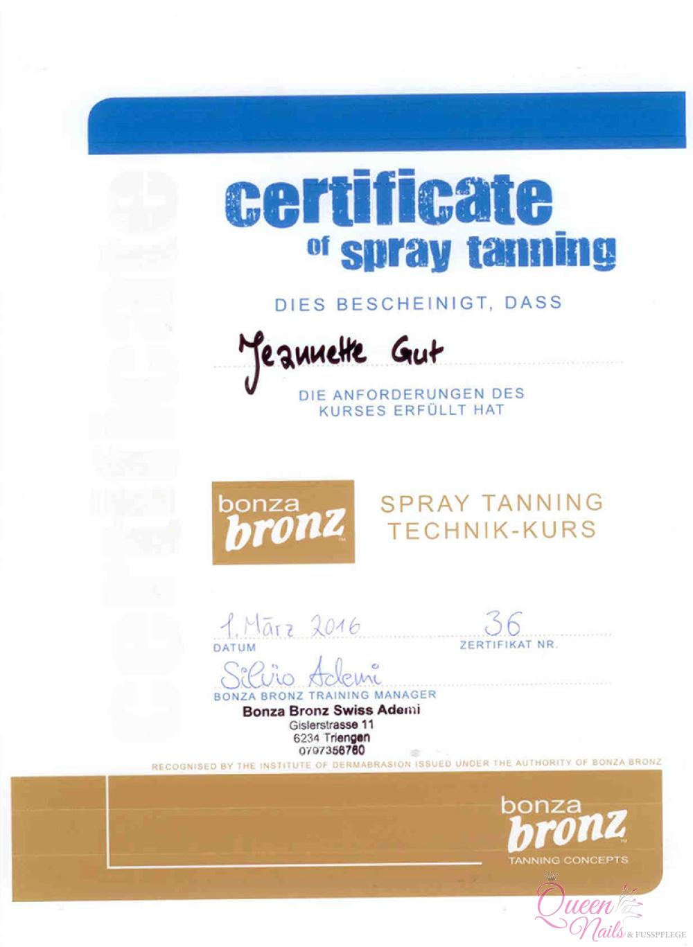 Lust auf gesunde Bräunung! Spray Tanning von Bonza Bronz konnten sich bis vor einiger Zeit nur die Stars leisten. Jetzt ist es bei uns auch voll im Trend. Gesunde und natürliche Bräune ohne die gefährliche UV-Strahlen. Auch geeignet für sehr sensible und empfindliche Haut, da der biologische Wirkstoff DHA 90 plus, hypoallergen, ölfrei, alkoholfrei und frei von Duftstoffen ist. Dieses Produkt wirkt sehr natürlich. Es ist weder karottenfarbig noch gelbstichig und verleiht dem ganzen Körper einen gleichmässigen Teint. Es gibt 5 verschiedene Brauntöne, so können Sie individuell Ihren bevorzugten Braunton wählen.
